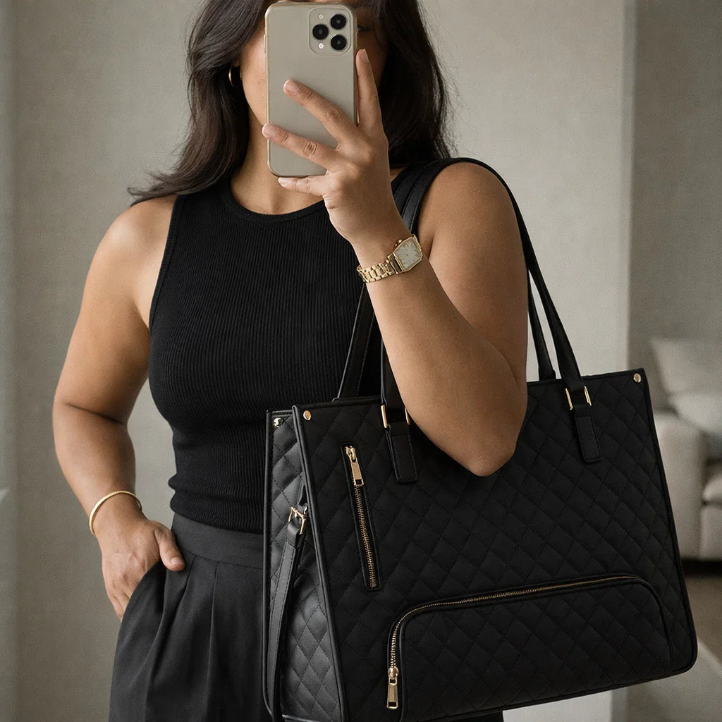 Crafted from premium quilted materials with elegant gold details, this tote transitions effortlessly from office to travel, from meetings to weekends.